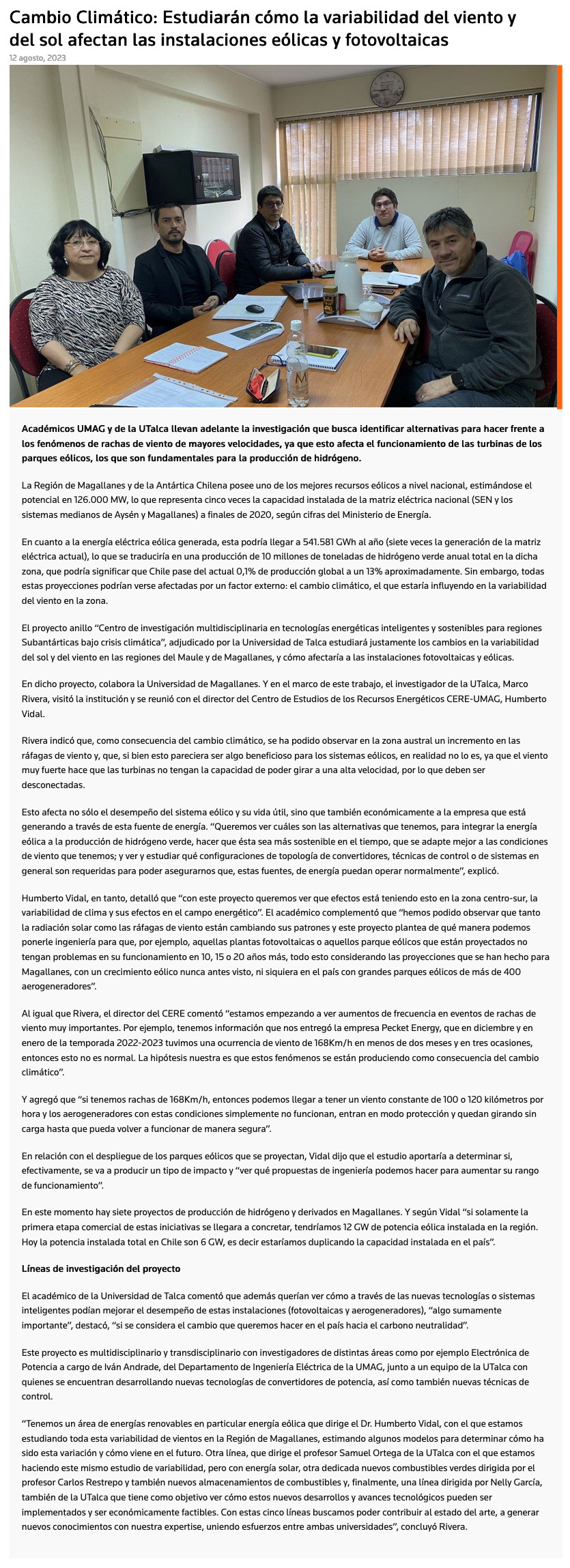 Cambio Climático: Estudiarán cómo la variabilidad del viento y del sol afectan las instalaciones eólicas y fotovoltaicas - (diarioelcentro.cl)