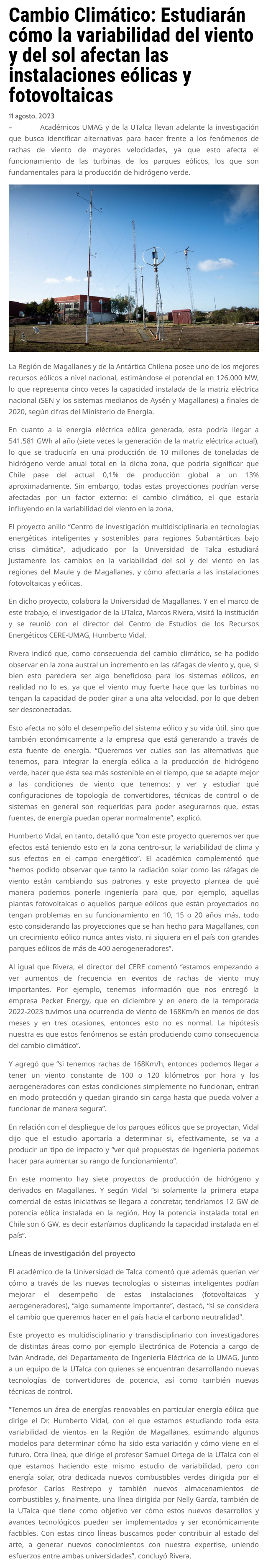 Cambio Climático: Estudiarán cómo la variabilidad del viento y del sol afectan las instalaciones eólicas y fotovoltaicas - (diarioelcentro.cl)