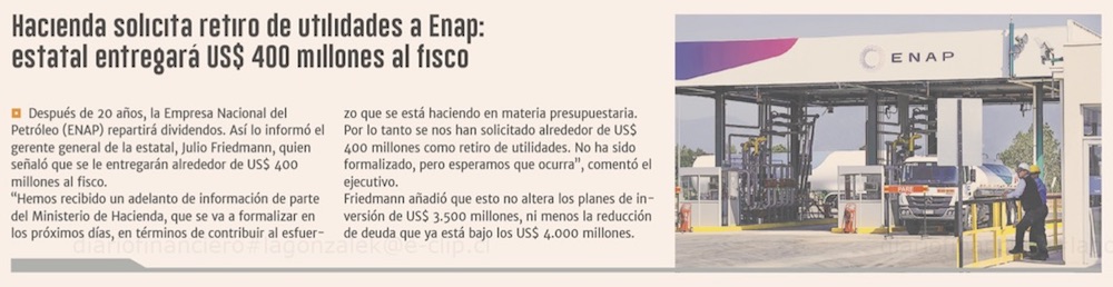 Ministerio de Hacienda informa a la Enap el retiro de utilidades por US$ 400 mills. - (El Mercurio de Santiago)