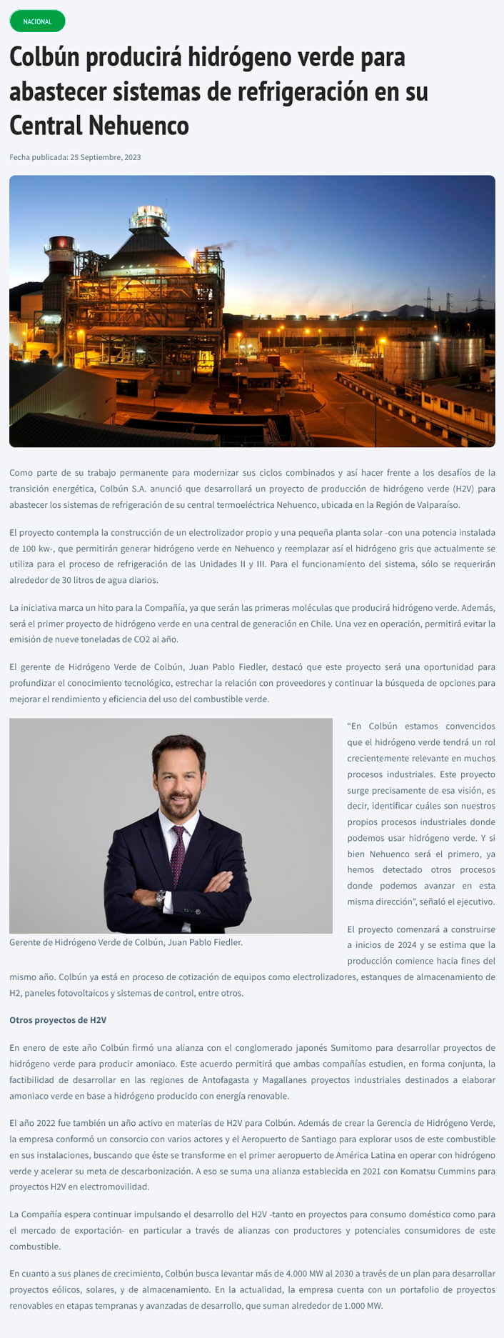 Colbún producirá hidrógeno verde para abastecer sistemas de refrigeración en su Central Nehuenco - (Estrategia Online)
