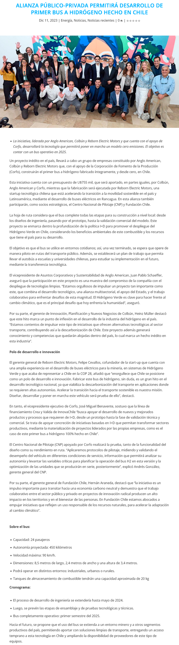 Colbún, Anglo American y Corfo lanzan inédito proyecto para desarrollar el primer bus a hidrógeno verde hecho en Chile - (La Tercera Online)
