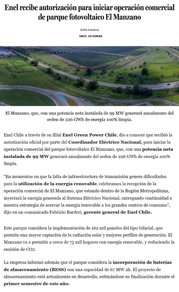 ENEL recibe autorización para iniciar la operación comercial del parque fotovoltaico El Manzano - (paiscircular.cl)