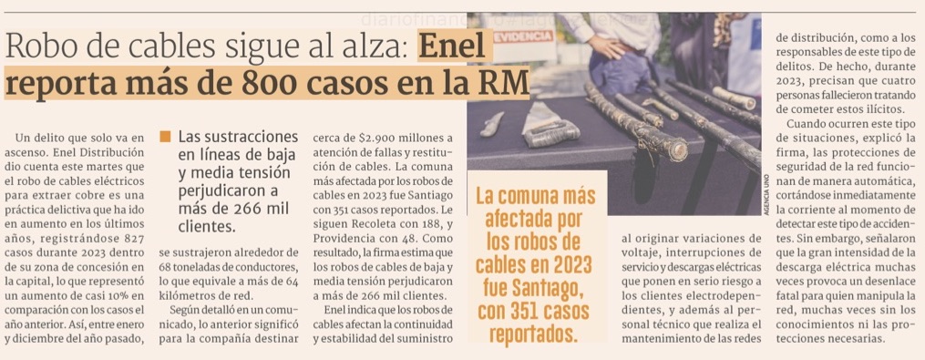 Robo de cables eléctricos en el último año equivale a la distancia entre Santiago y Temuco - (El Mercurio de Santiago)