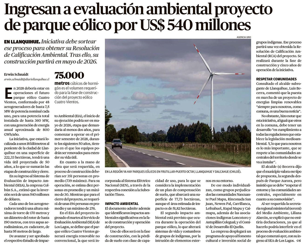 Ingresan a evaluación ambiental proyecto de parqu eólico por US$540 millones - (El Llanquihue)