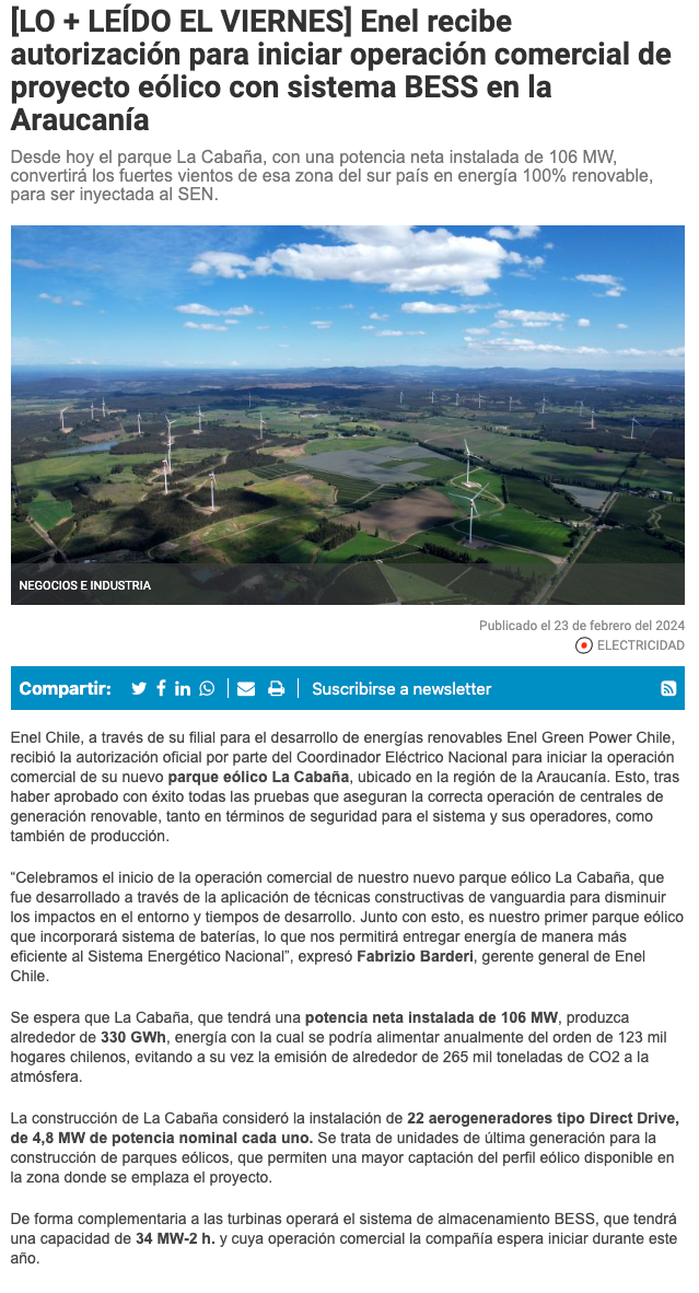 Enel Chile recibe autorización para iniciar operación comercial de nuevo parque eólico - (araucanianoticias.cl)