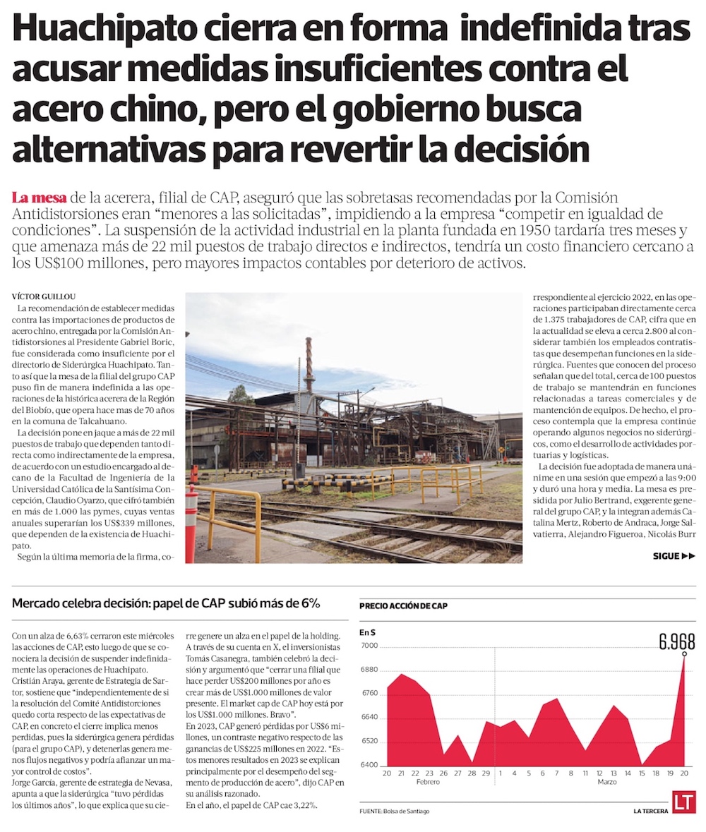 CAP anuncia cierre de Huachipato, pero lo condiciona a acciones que tome el Gobierno - (El Mercurio de Santiago)