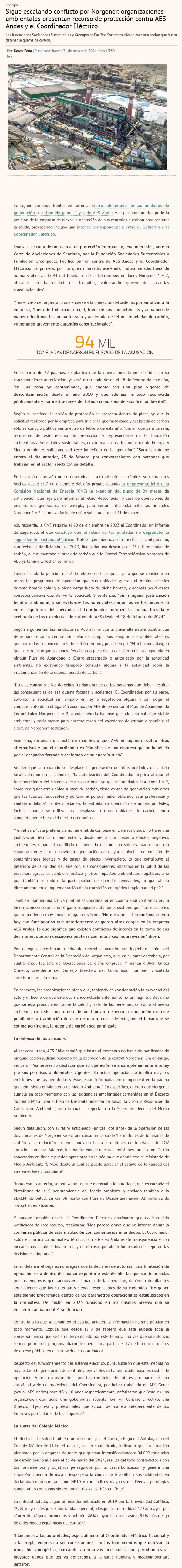 Escala conflicto por Norgener: organizaciones ambientales interponen recurso de protección contra AES Andes y el Coordinador Eléctrico - (Diario Financiero)