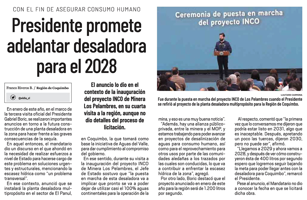 Presidente Boric inaugura planta desaladora en mina Los Pelambres - (Pulso)