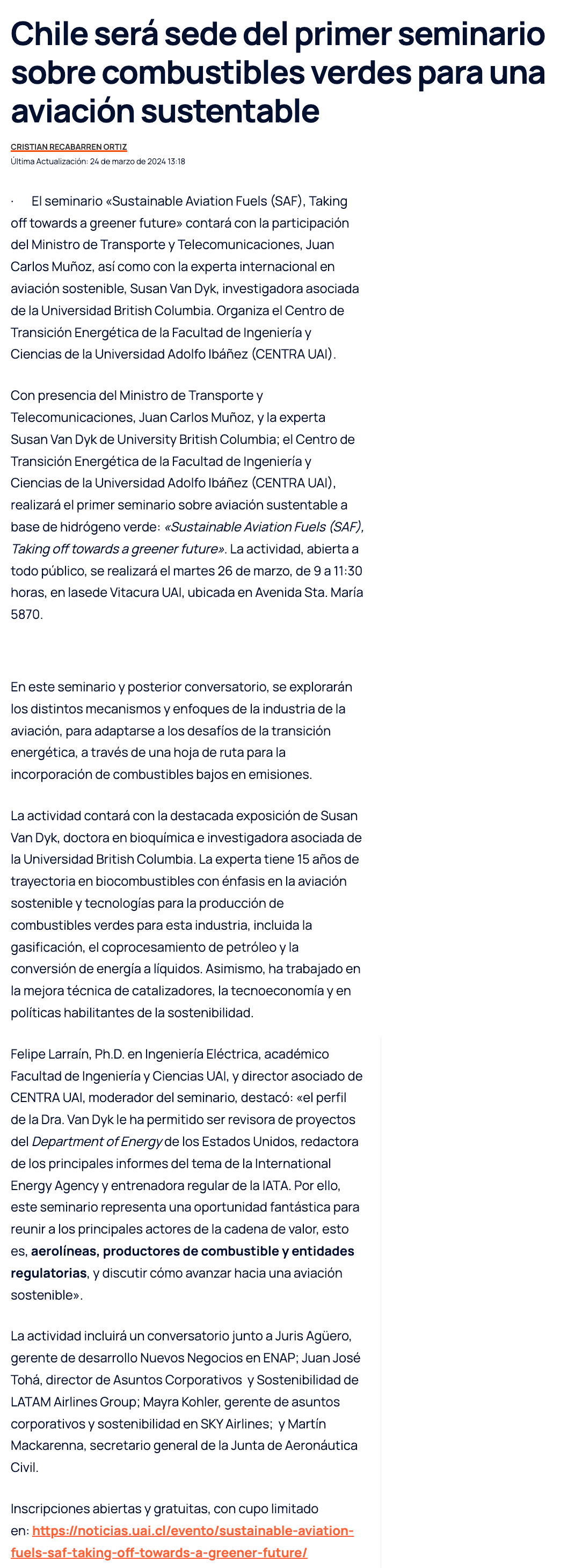 Chile será sede del primer seminario sobre combustibles verdes para una aviación sustentable - (portalinnova.cl)
