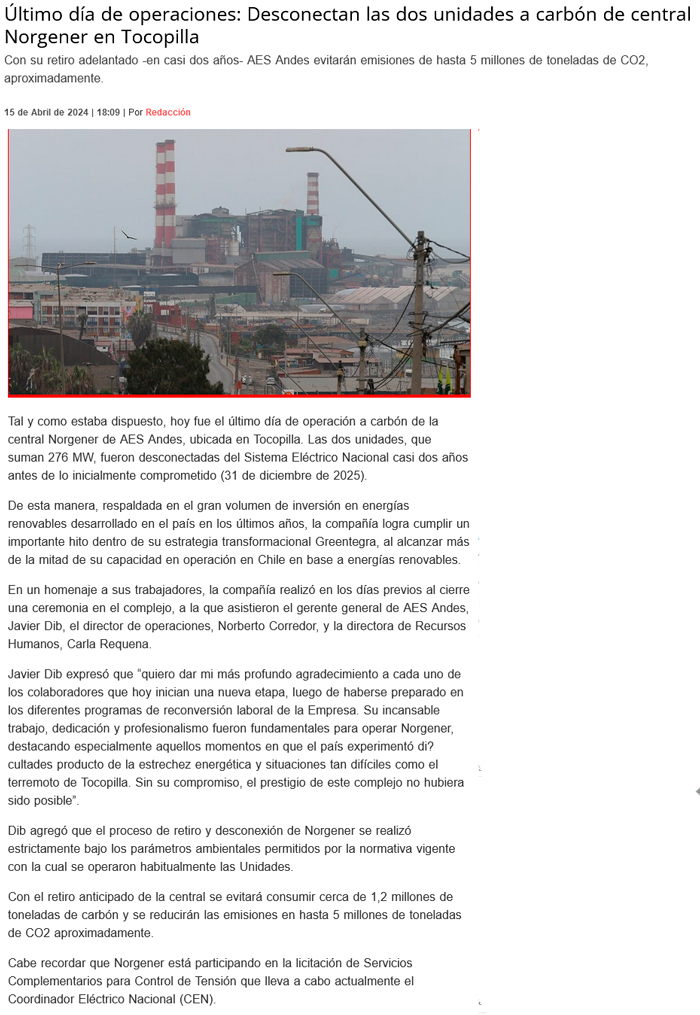 Ayer dejó de operar carbonera Norgener - (El Mercurio de Santiago)
