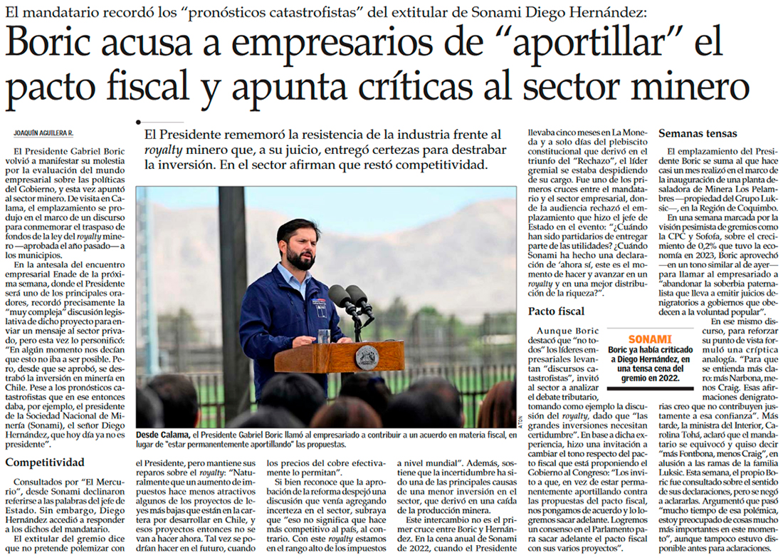 Boric polemiza con mineros al afirmar que el royalty “destrabó la inversión” - (Diario Financiero)