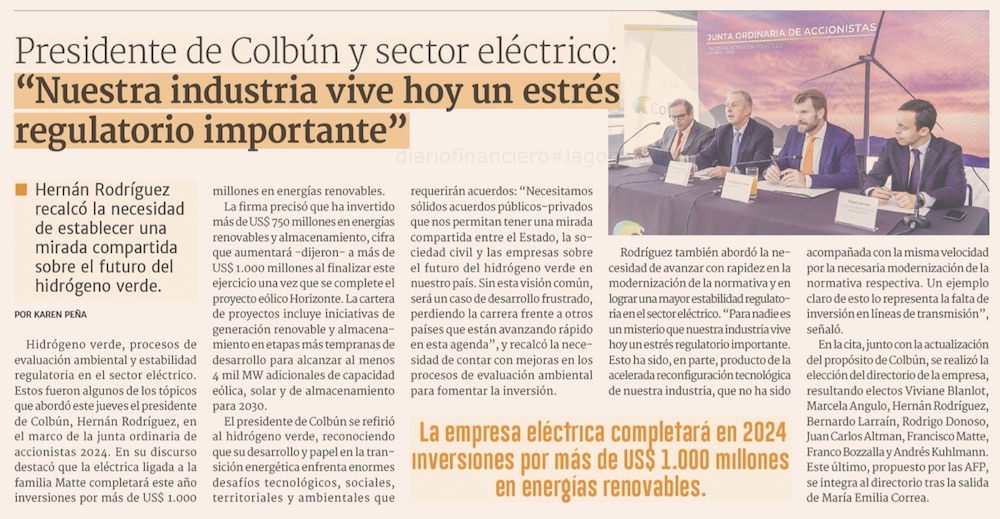 Presidente de Colbún apunta a lograr una mayor estabilidad regulatoria en el sector eléctrico - (Pulso)