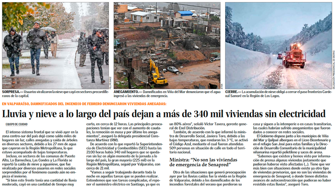 Sistema frontal frío azota la zona central causando cortes en rutas y de energía eléctrica - (La Tercera)