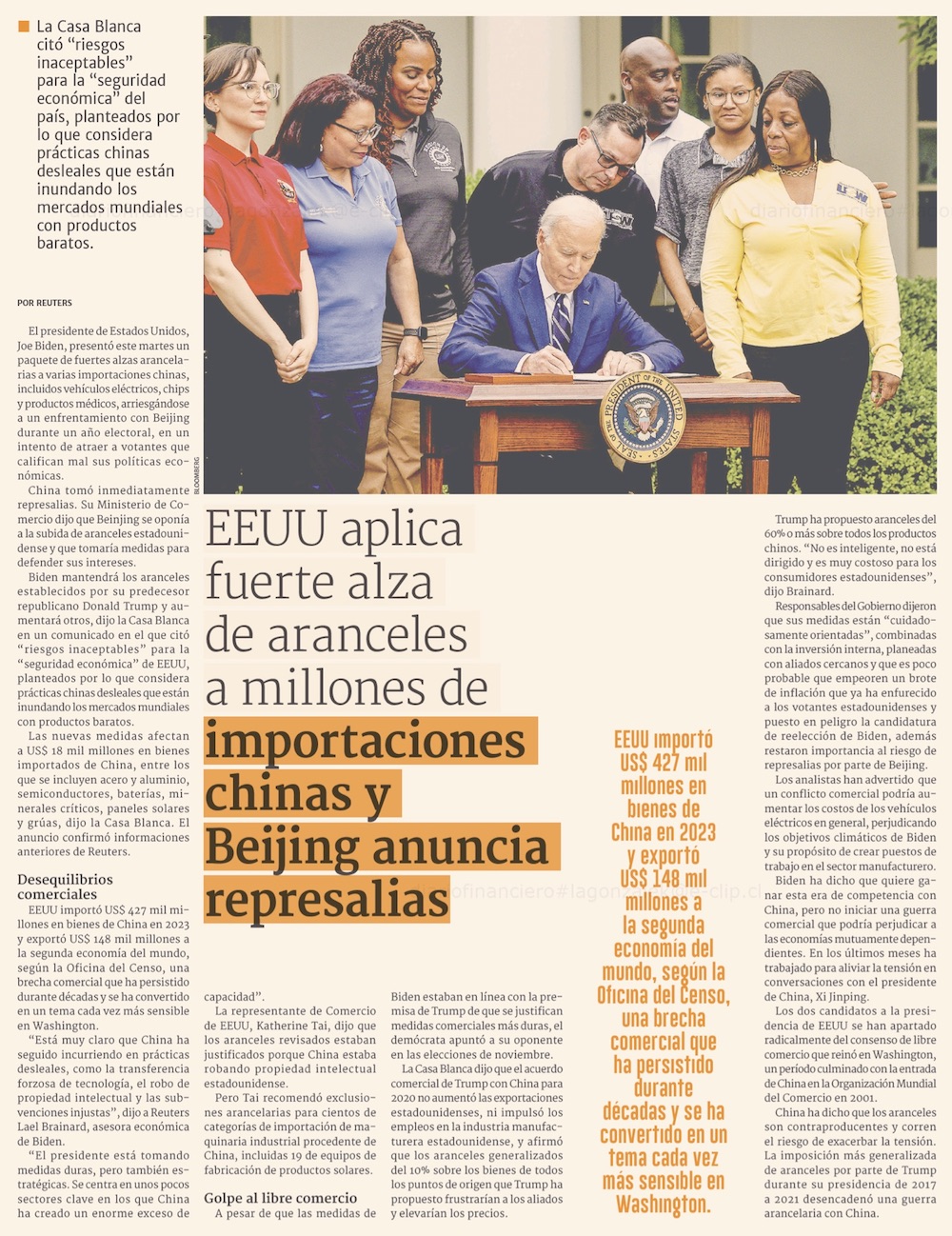 Biden escala “guerra de los aranceles” con China al imponer tasas a productos estratégicos - (El Mercurio de Santiago)