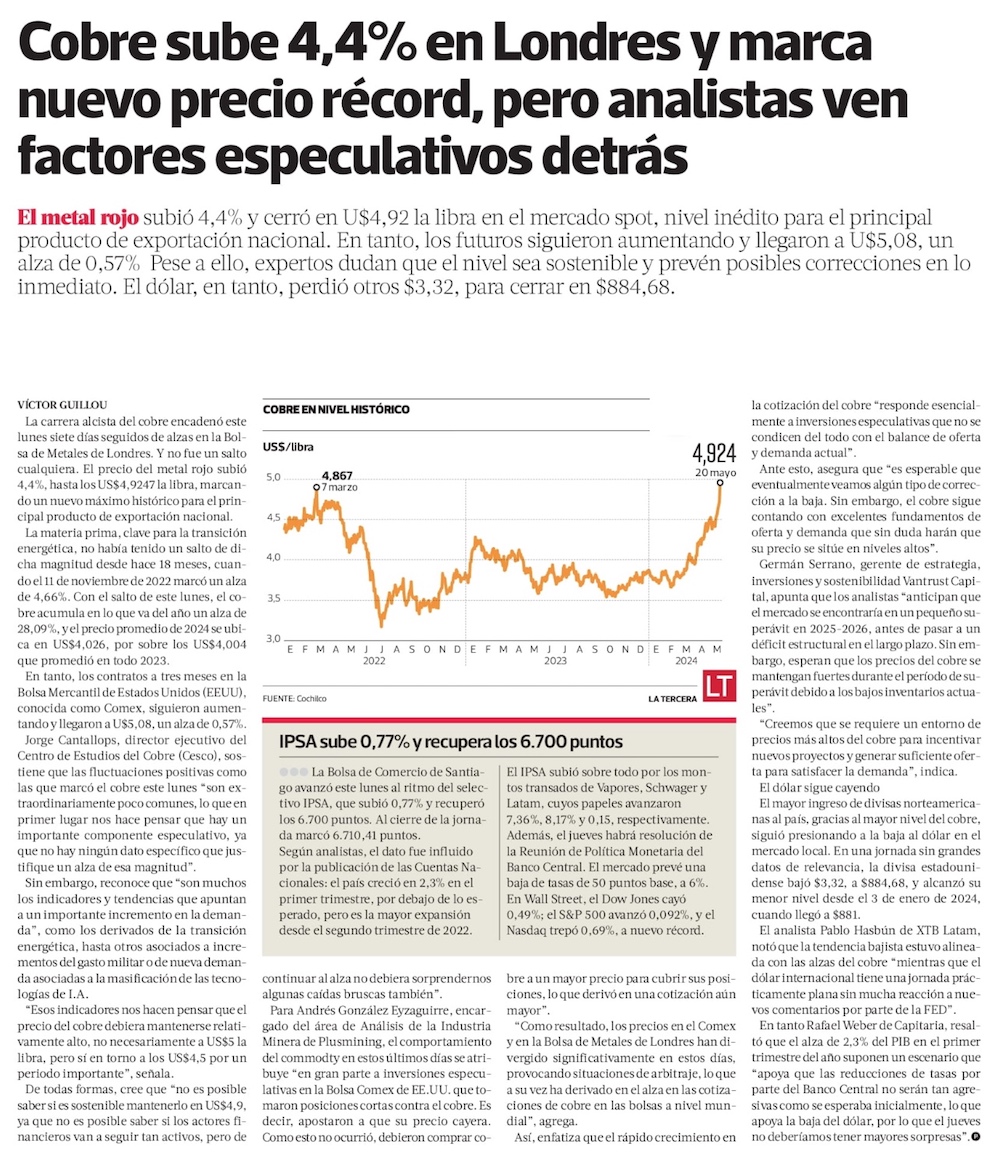 Precio del cobre frena su tendencia alcista y cae este martes, ubicándose bajo los US$ 4,9 la libra - (Diario Financiero)