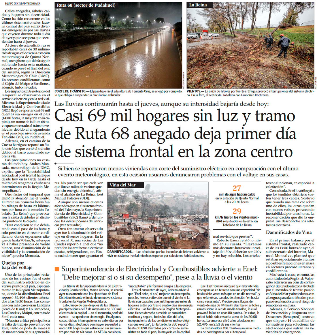 Sistema frontal mantiene a 5.650 clientes sin suministro eléctrico en la RM y se prevé nuevo pulso de precipitaciones - (La Tercera)