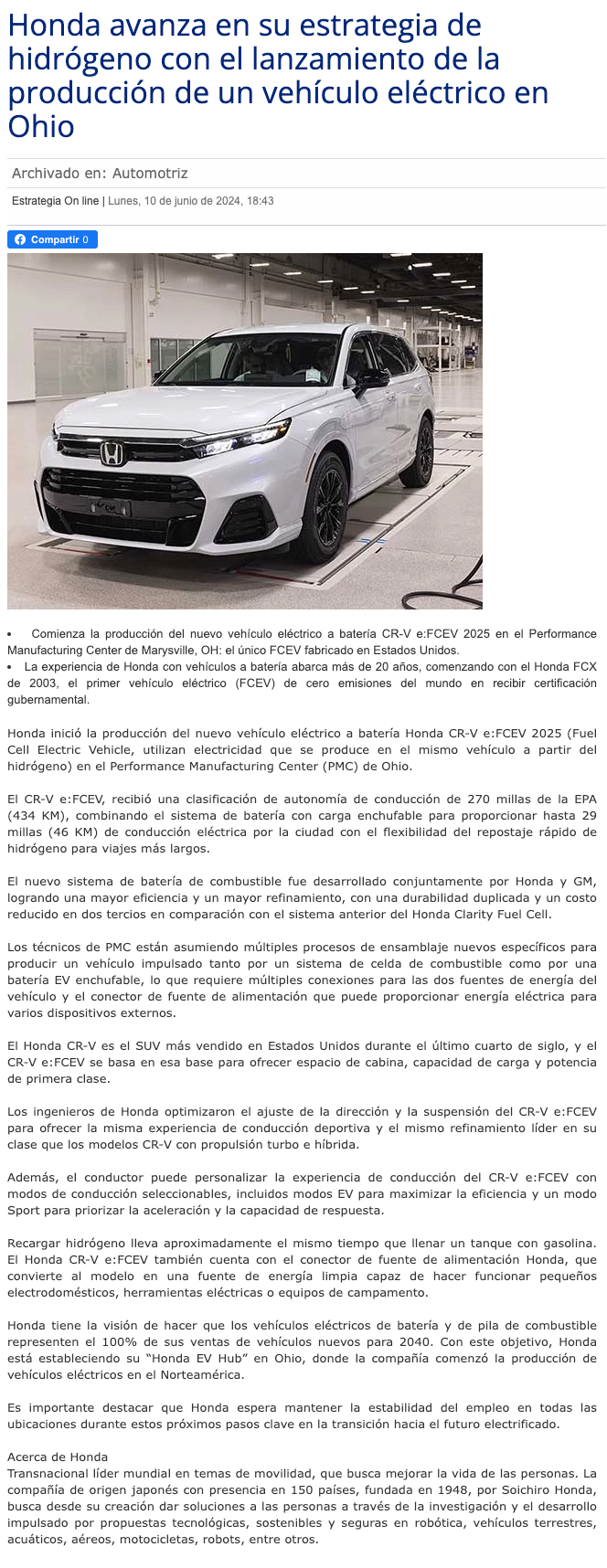 Honda avanza en su estrategia de hidrógeno con el lanzamiento de la producción de un vehículo eléctrico en Ohio - (presslatam.cl)