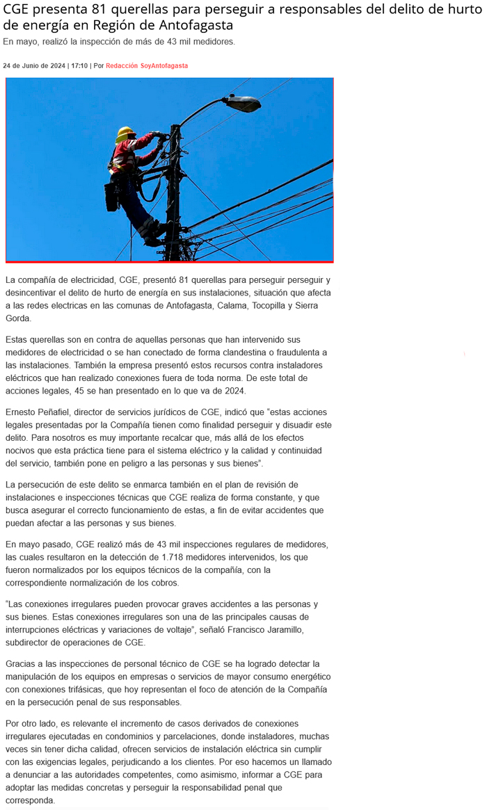 CGE presenta 81 querellas para perseguir delito de hurto de energía - (El Mercurio de Antofagasta)