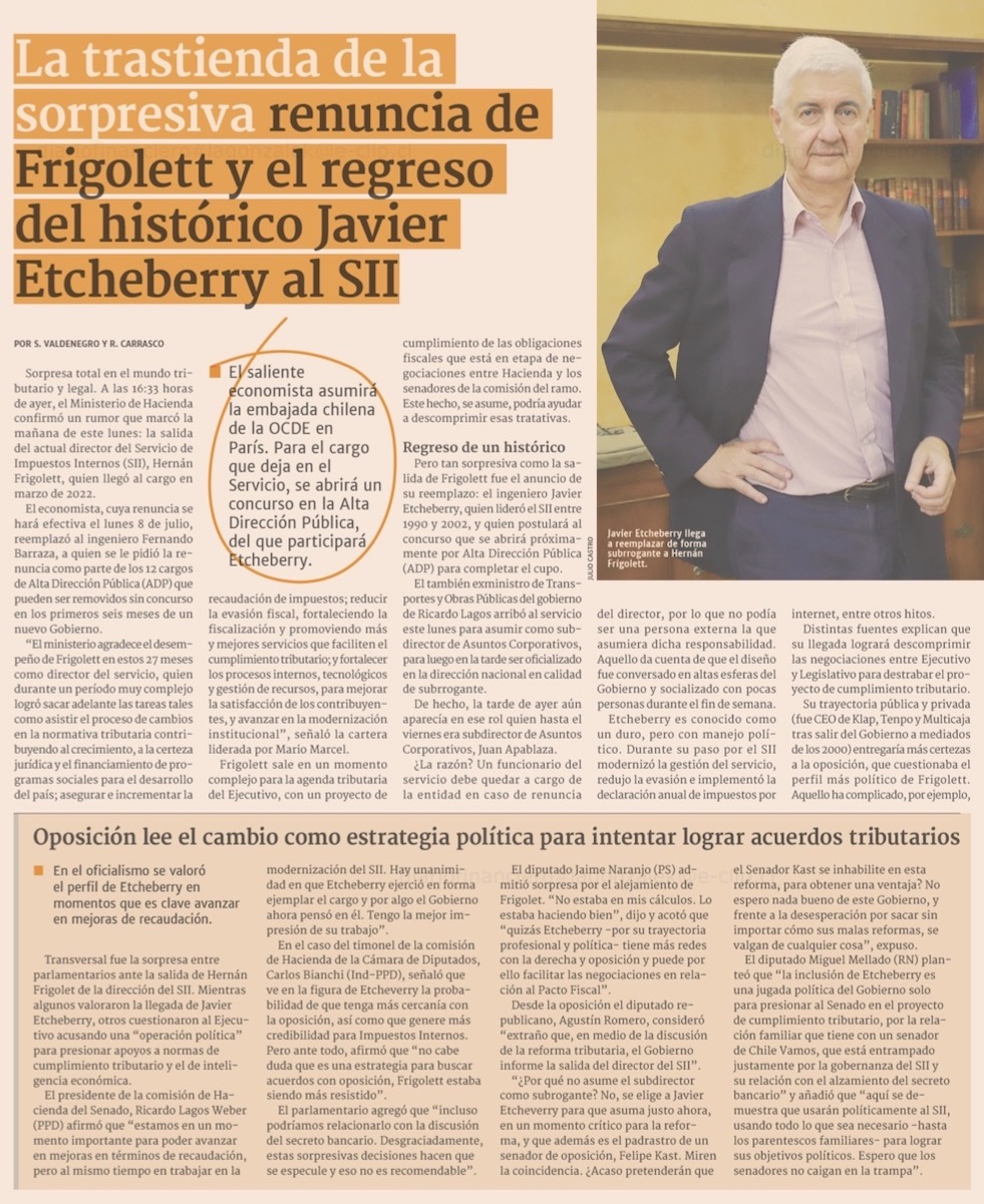 En medio de problemas, Frigolett deja el SII y Gobierno lo reemplaza con Javier Etcheberry - (El Mercurio de Santiago)