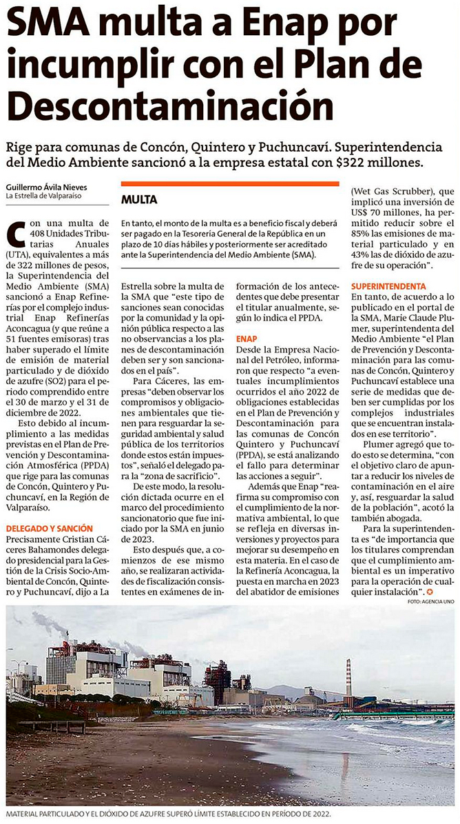 Enap deberá pagar $ 322 millones de multa por emisiones contaminantes - (El Mercurio de Valparaíso)