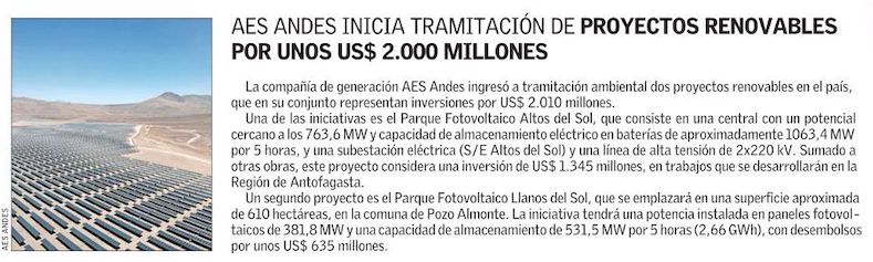 AES proyecta invertir US$2.010 millones en dos nuevos parques solares en Chile - (La Segunda)