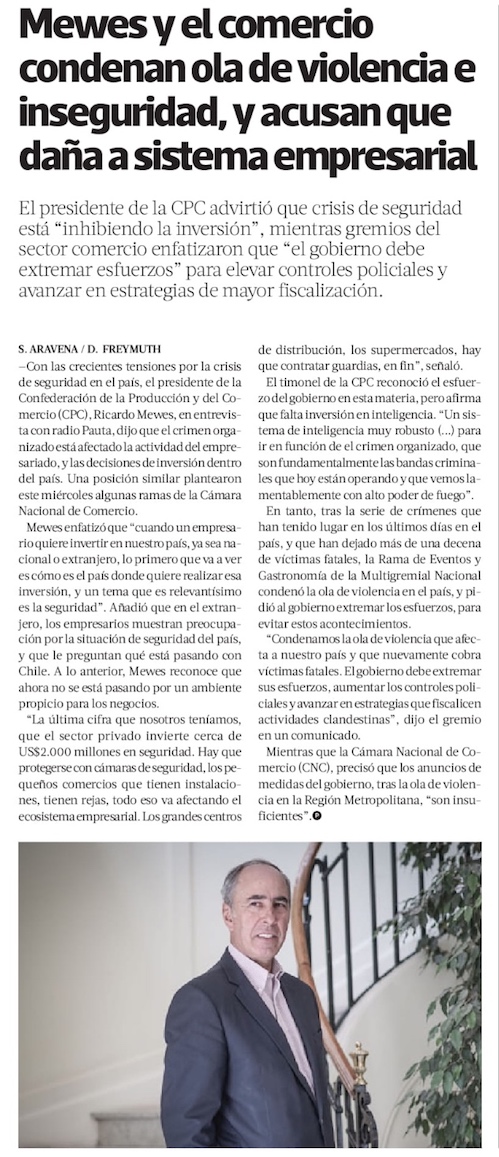 Empresarios advierten deterioro para la imagen de Chile en el extranjero por crisis de seguridad - (El Mercurio de Santiago)