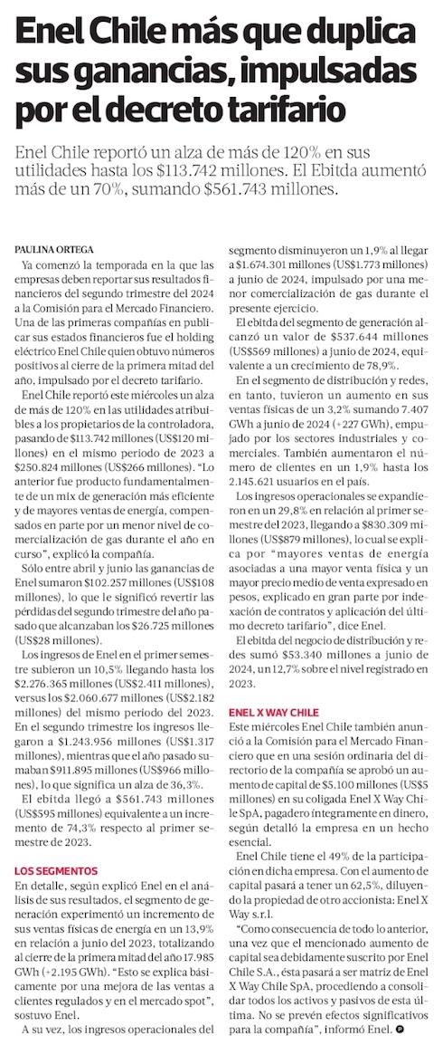 Enel Chile aumentó en 120% sus ganancias a junio, y último decreto tarifario impulsó alza en ingresos - (Diario Financiero)