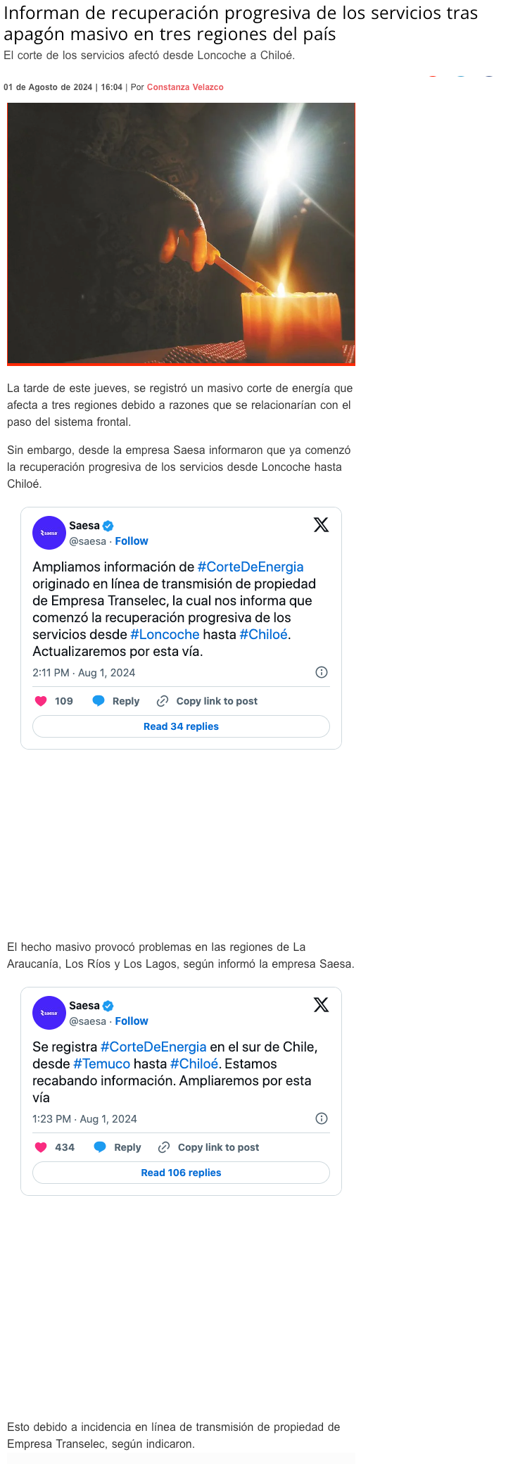 Masivo corte de luz afecta desde la región de La Araucanía hasta Los Lagos por sistema frontal - (biobiochile online)