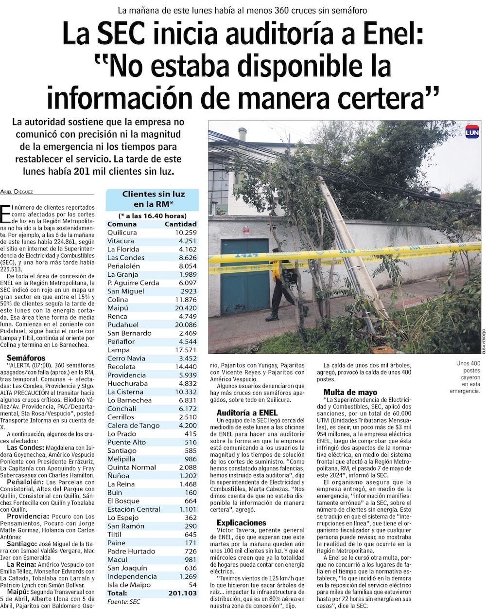 SEC multa con $3.900 millones a Enel por apagones de mayo - (La Segunda)