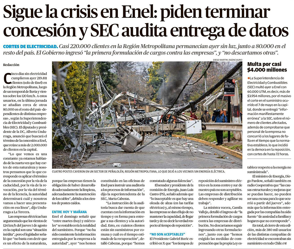 SEC multa con $3.900 millones a Enel por apagones de mayo - (La Segunda)