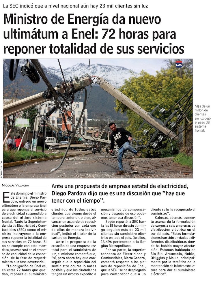 Gobierno comunica tercer ultimátum a Enel: antes del miércoles deberán restituir suministro a clientes restantes - (El Mercurio de Santiago)