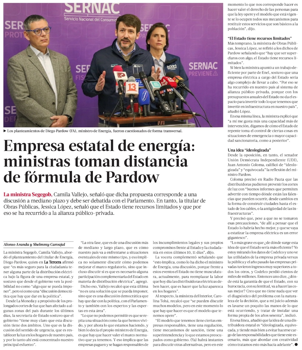 MOP y vocera de Gobierno toman distancia de Pardow sobre capacidad del Estado para reemplazar a privados - (El Mercurio de Santiago)