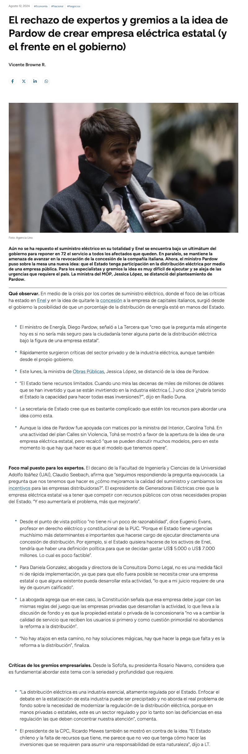 MOP y vocera de Gobierno toman distancia de Pardow sobre capacidad del Estado para reemplazar a privados - (El Mercurio de Santiago)
