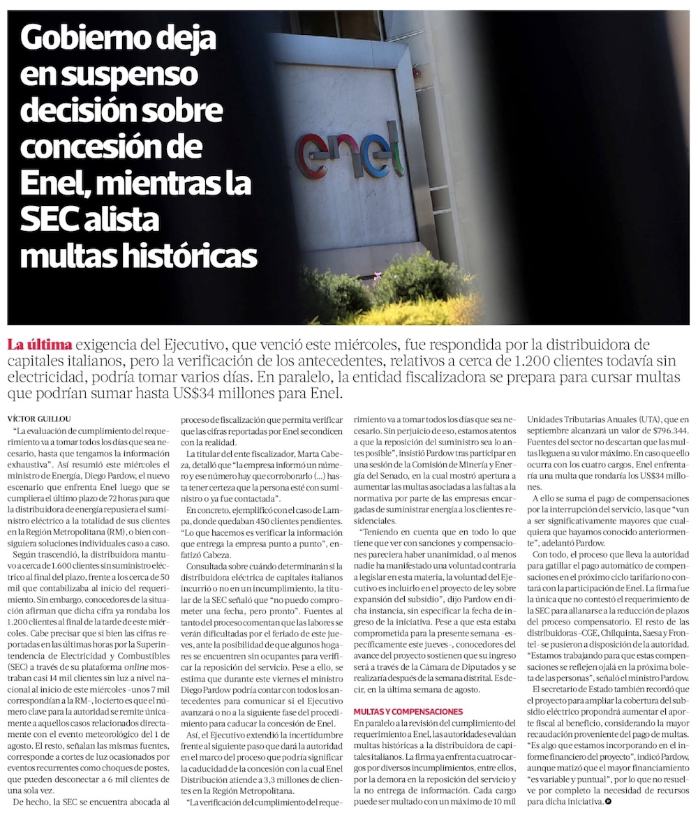 Tras dos días del ultimátum, Gobierno aún no sabe si Enel cumplió compromiso de restablecer suministro - (El Mercurio de Santiago)