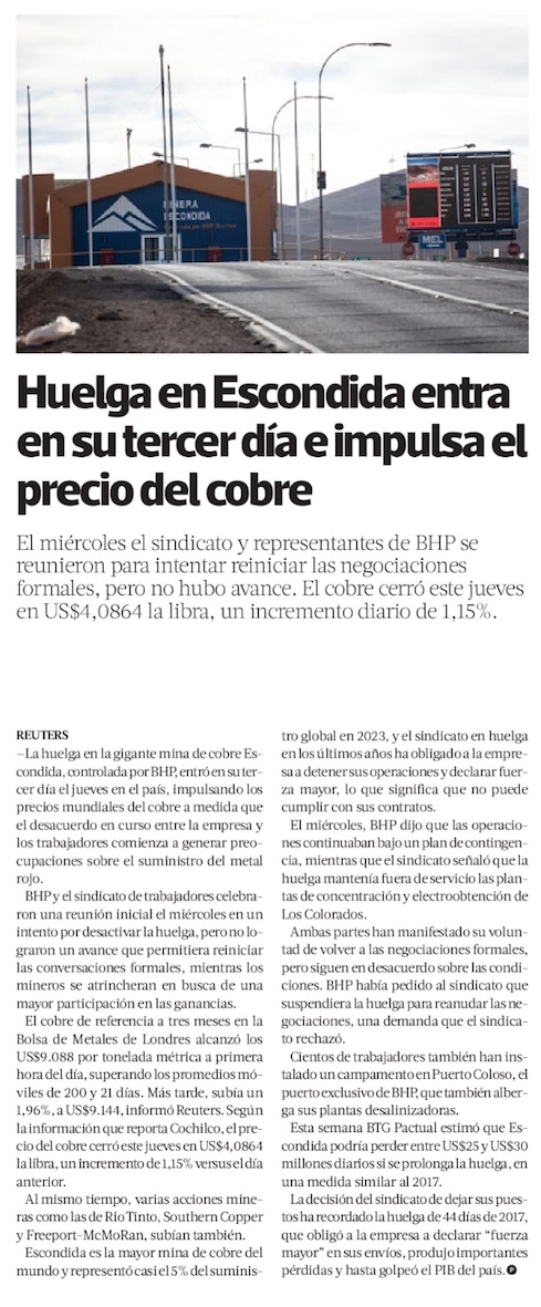 Precio del cobre sube 1,16% en medio de huelgas de faenas mineras en Chile - (El Mercurio de Santiago)