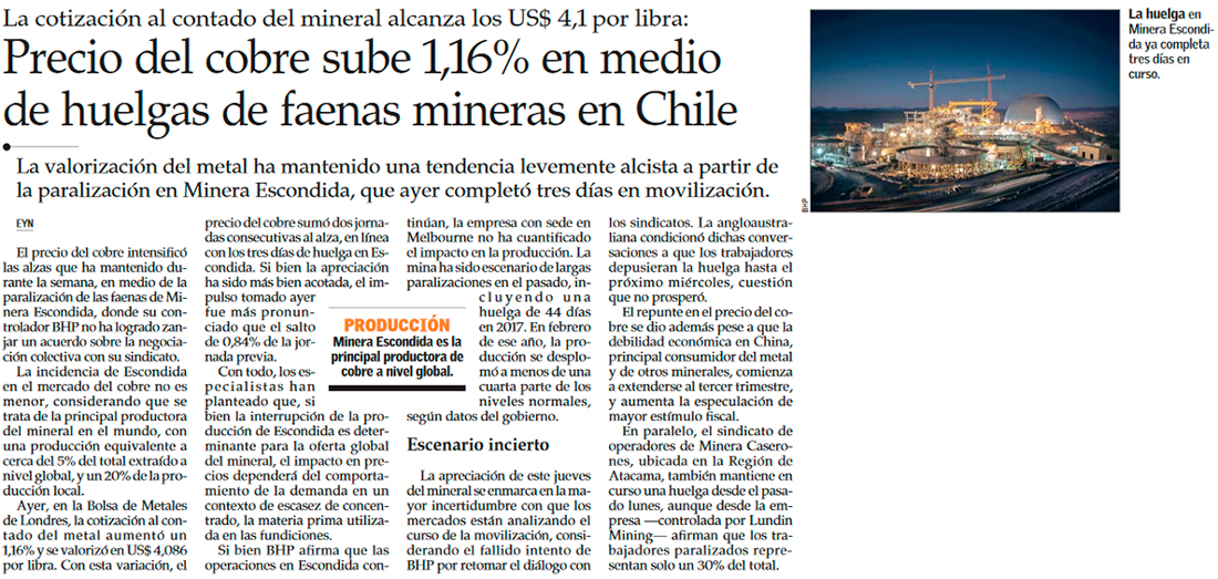 Huelga en Escondida entra en su tercer día e impulsa el precio del cobre - (Pulso)