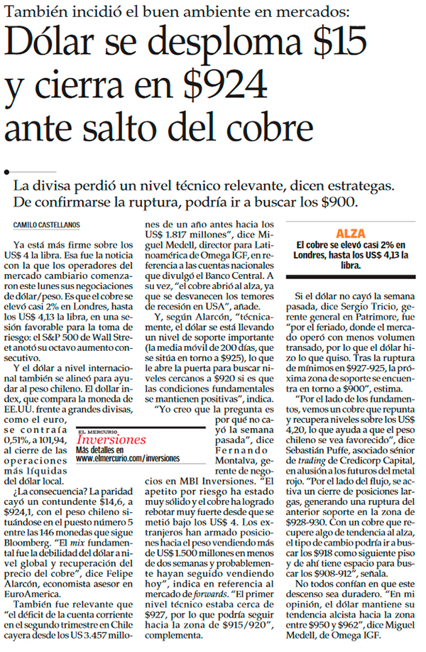 Dólar pierde $15, su mayor caída en más de un mes, por fuerte avance del cobre - (Pulso)