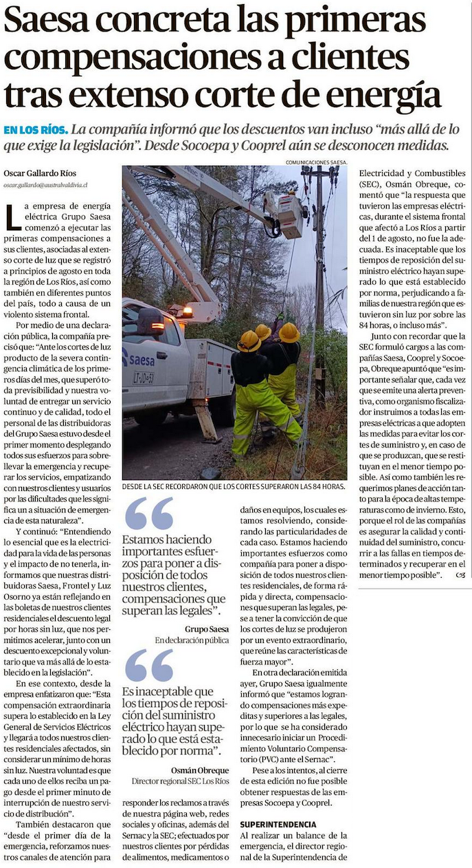 Caminos para compensar por cortes de luz tensan relación con el Sernac: CGE se suma a PVC, pero Saesa lo descarta - (Diario Financiero)