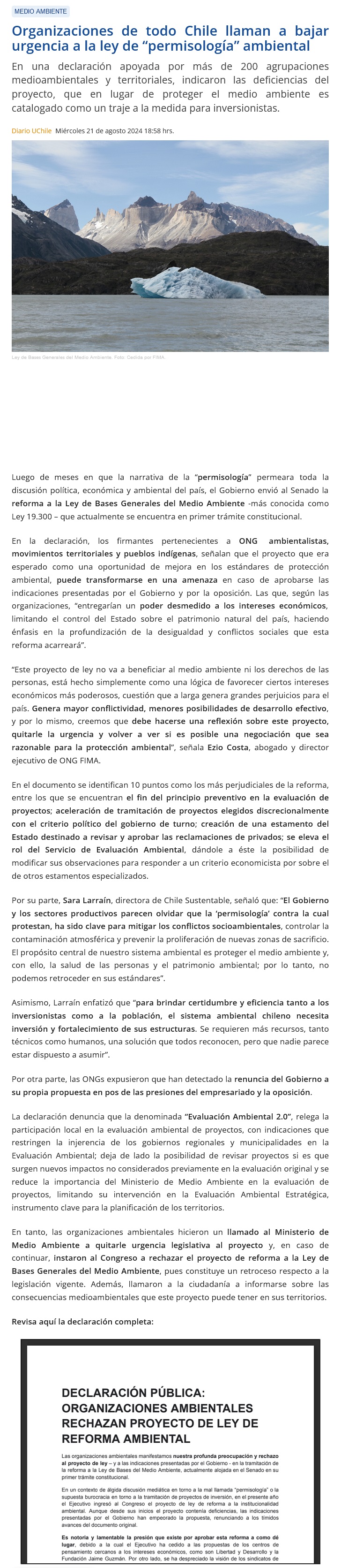 ONGs llaman a quitar la urgencia al proyecto de ley de "permisología ambiental" - (cooperativa online)
