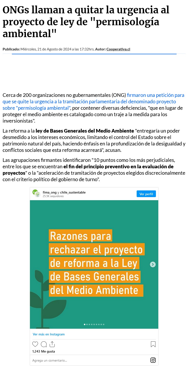 Organizaciones de todo Chile llaman a bajar urgencia a la ley de “permisología” ambiental - (radio.uchile online)