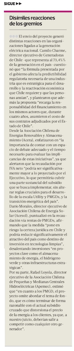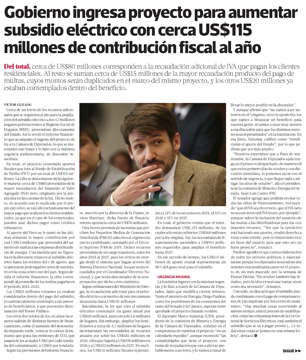 Cargos por retiros de energía financiarán la mitad del subsidio a cuentas de la luz: US$150 millones al año - (Diario Financiero)