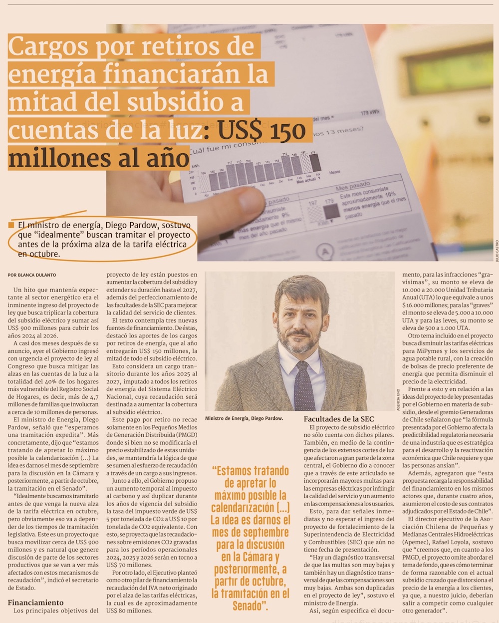 Gobierno ingresa proyecto para aumentar subsidio eléctrico con cerca US$115 millones de contribución fiscal al año - (Pulso)