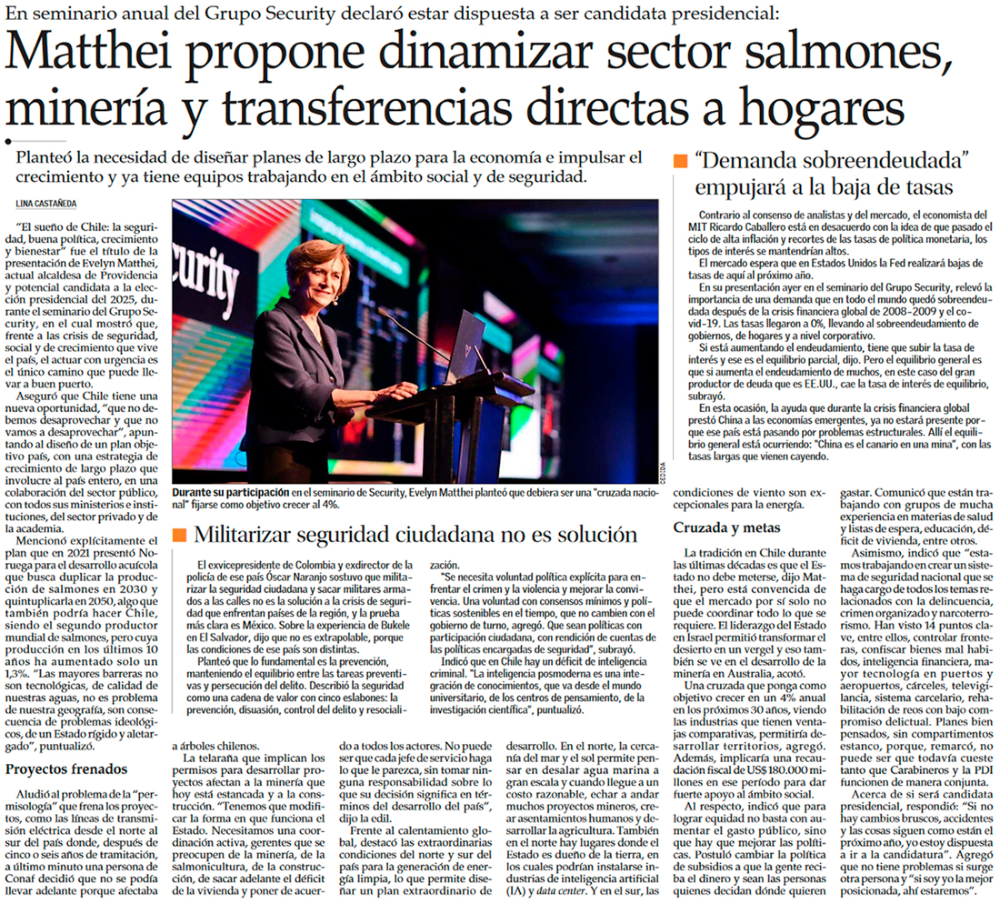 Salmones, desalar agua marina y mayor coordinación: las ideas de Matthei para hacer crecer a Chile 4% - (Diario Financiero)