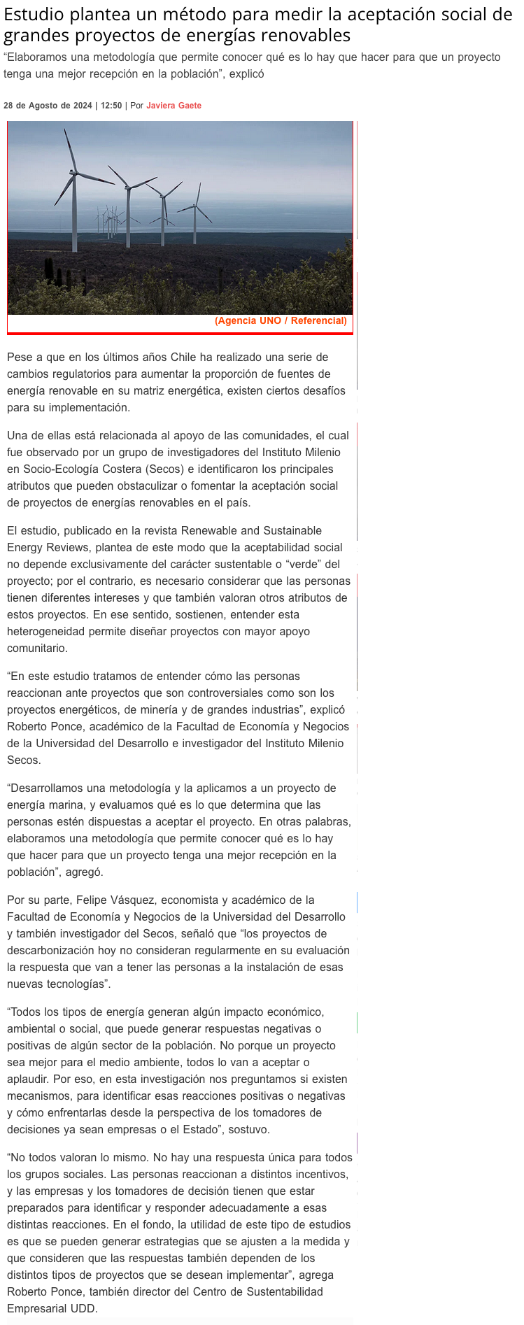 Estudio propone un método para medir la aceptación social de grandes proyectos de energías renovables - (mundoacuicola.cl)