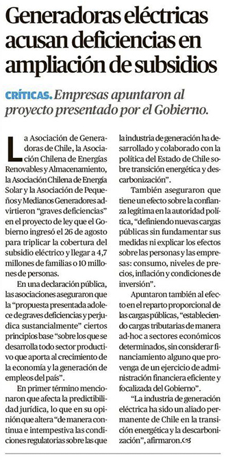 Generadoras acusan “graves perjuicios” por proyecto que amplia subsidio eléctrico - (La Segunda)