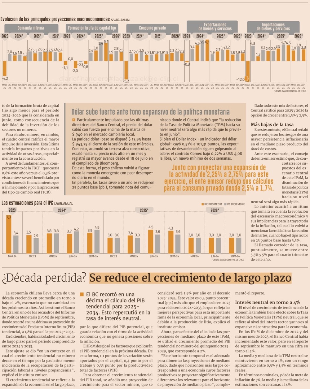 BC recorta cálculo de crecimiento y eleva inflación, mientras alerta por débil expansión para los próximos 10 años - (El Mercurio de Santiago)