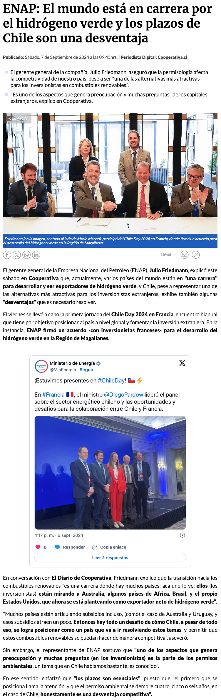ENAP: El mundo está en carrera por el hidrógeno verde y los plazos de Chile son una desventaja - (cooperativa online)