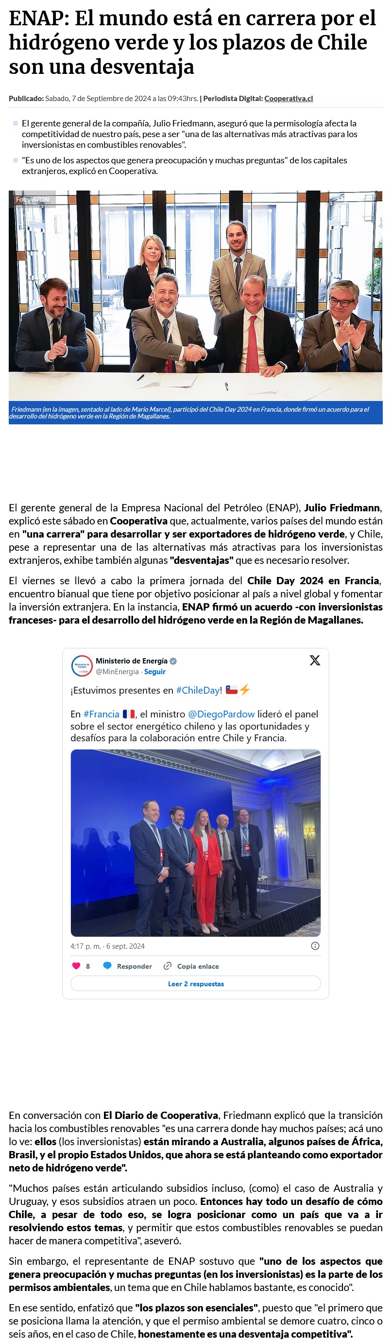 ENAP: El mundo está en carrera por el hidrógeno verde y los plazos de Chile son una desventaja - (biobiochile online)