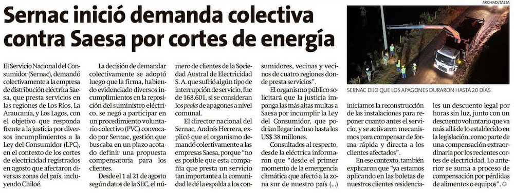Sernac demandó colectivamente a Saesa por cortes de luz en la zona - (El Llanquihue)