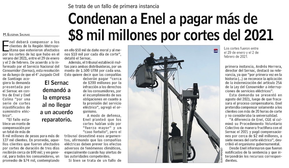 Condenan a Enel a pagar indemnizaciones sobre los $8 mil millones por cortes de luz de 2021 - (El Mercurio de Santiago)